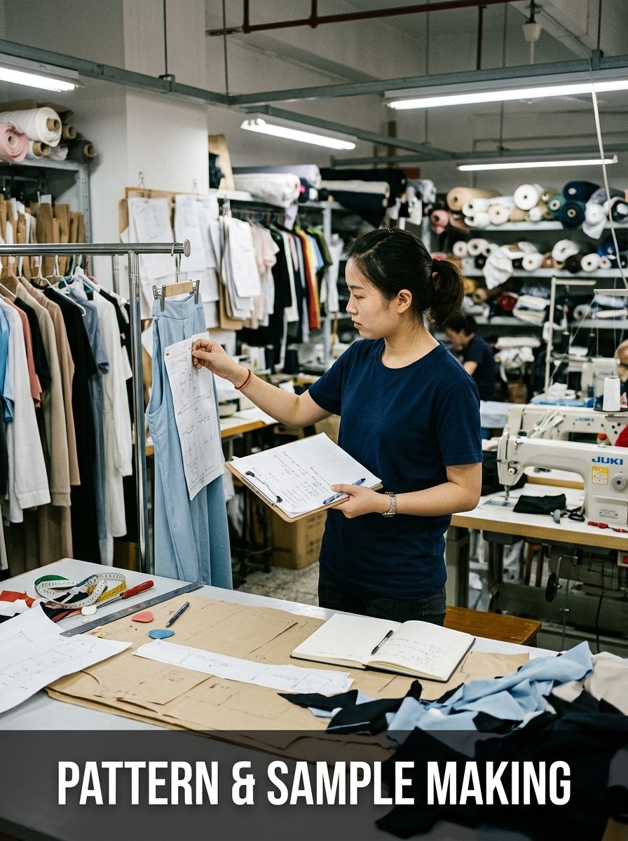 We are committed to making custom clothing development easier, faster, and more reliable for every brand. Whether you provide detailed sketches, technical packs, reference samples, or initial concepts, our experienced pattern makers, sample technicians, and production team can transform your ideas into high-quality finished garments. From fabric selection and pattern development to sample making, fit adjustments, and bulk production planning, every step is handled with precision and close communication.