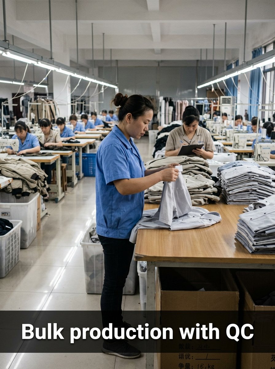Our China clothing manufacturer workshop is equipped with advanced production lines, skilled workers, and strict quality control processes to ensure efficient manufacturing, stable quality, and reliable delivery for every apparel order.
