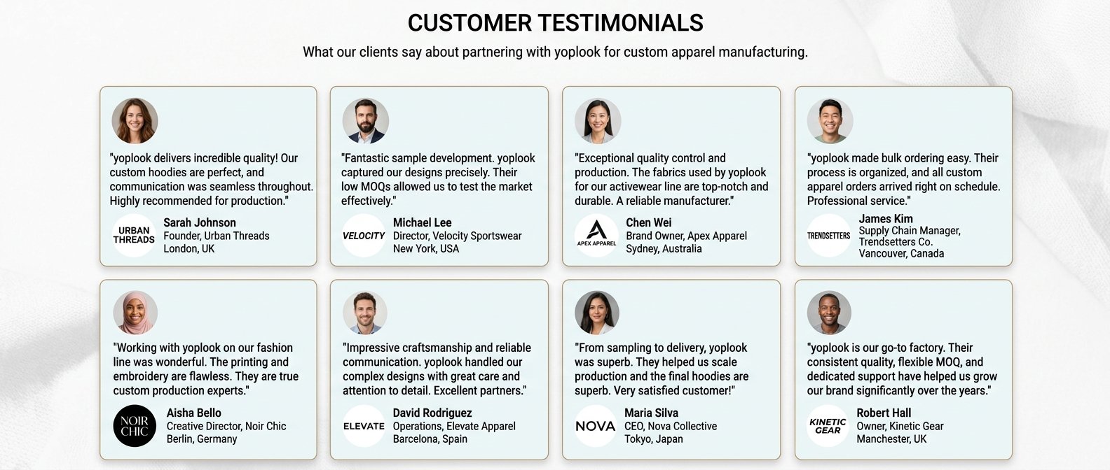 YOPLOOK is a professional custom apparel factory dedicated to providing reliable OEM and ODM clothing manufacturing services for brands worldwide. With strong production capabilities, experienced technical teams, and a strict quality control system, we support every key stage of apparel development, from concept discussion and fabric sourcing to pattern making, sample development, bulk production, and final delivery. We understand that every brand has different goals, positioning, and product requirements, so we offer flexible customization solutions designed to match your specific needs. Whether you are launching a new clothing brand, expanding an existing collection, or developing private label apparel, YOPLOOK is committed to helping you bring your ideas to market with stable quality, efficient production, and dependable service.