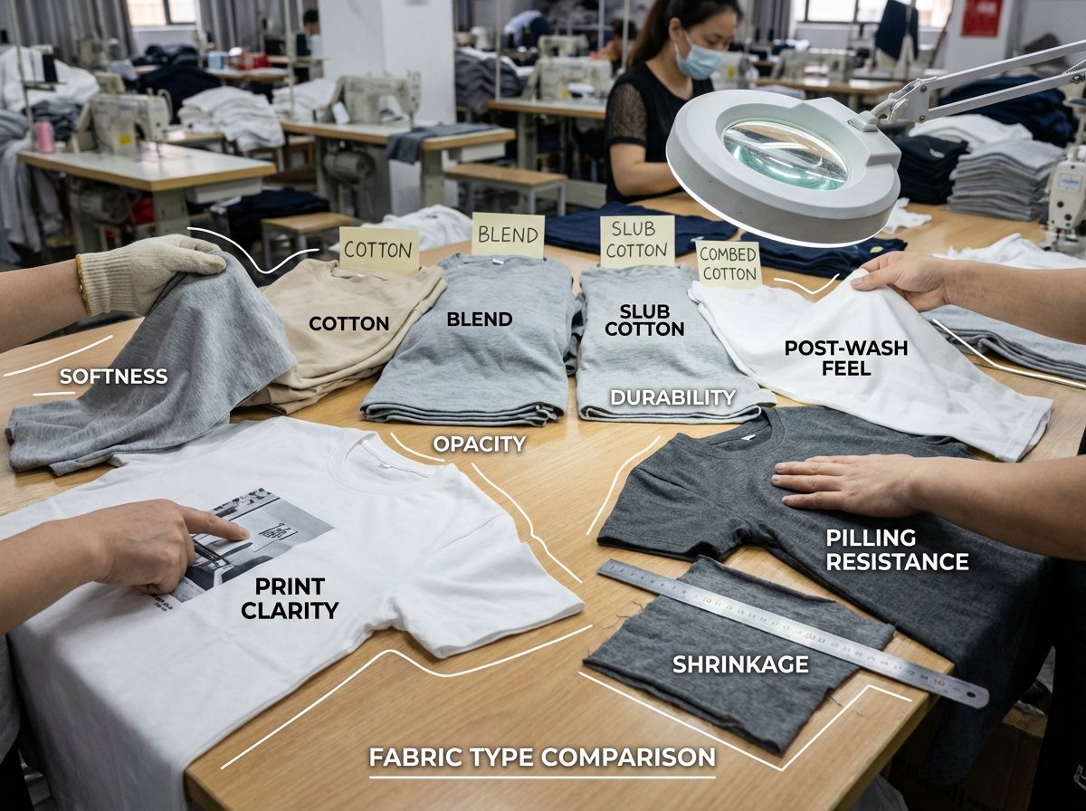 Fabric type affects print results by changing surface smoothness, absorption, stretch, and texture. It affects shrinkage through fiber behavior and finishing. It affects wear performance through pilling resistance, shape retention, durability, and opacity.