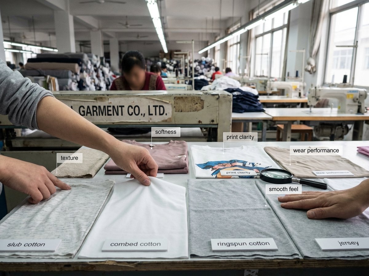 Choosing T-shirt fabric looks simple at first, but the wrong fabric leads to thin handfeel, shrinkage, pilling, bad print results, and poor long-term wear.
